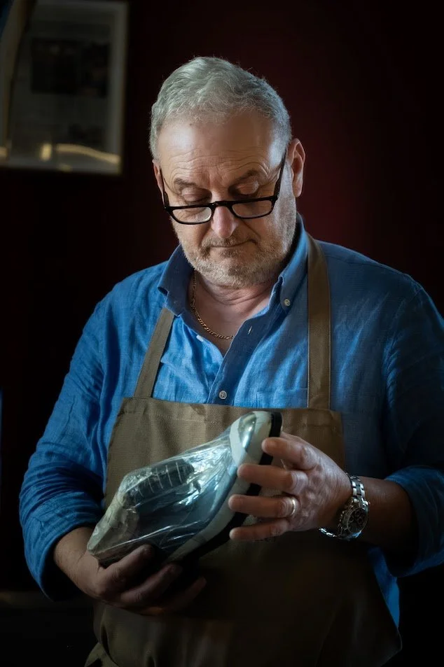 Now that my brother is no longer with us, I feel it is my duty to carry on our ideal of the traditional artisan made shoes. I still go and personally select the best Vegetable tanned leather from Santa Croce, I design, cut and follow the entire process of our good year hand welted shoes..”